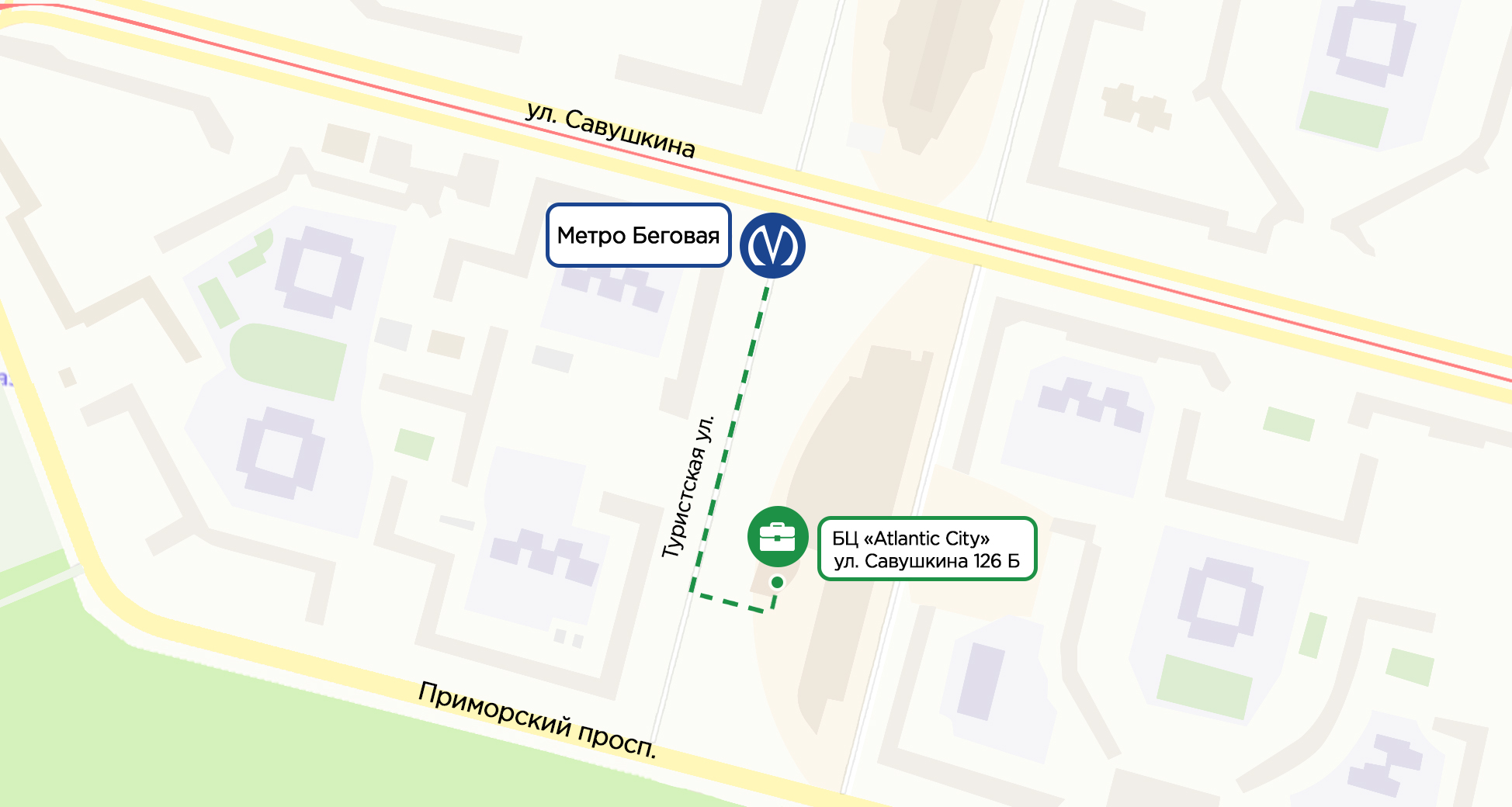 Если вы любите гулять и вам по душе пешие маршруты - наш офис находится в 5 минутах от «Парка им. 300 Санкт-Петербурга» - после реконструкции он стал еще краше. И всего в 2х минутах от метро «Беговая»: вход в бизнес центр «Атлантик Сити» (отдельное, высокое здание бизнес центра, не торговый центр).
