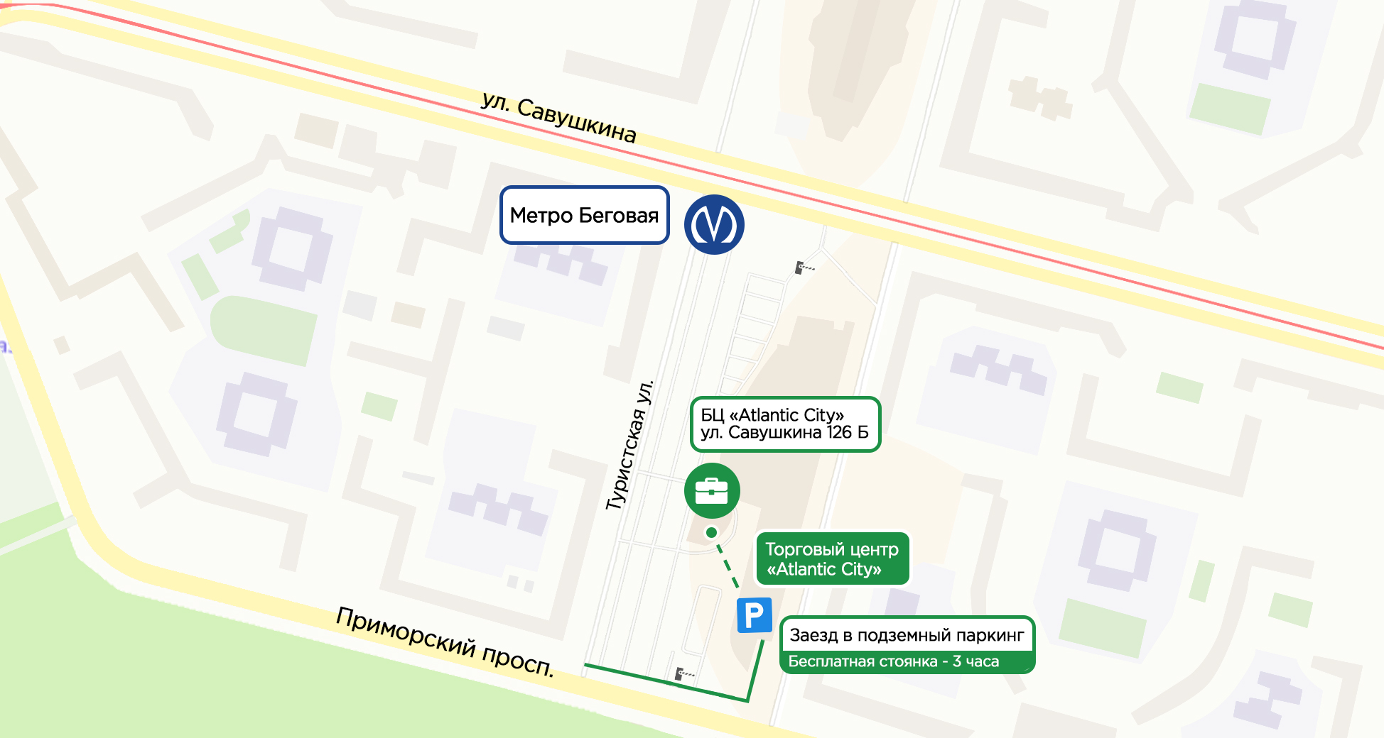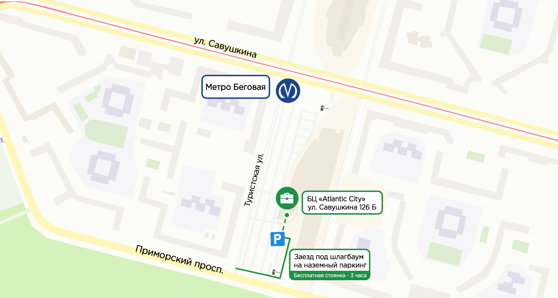 «Время - деньги», понимаем и для наших автомобилистов возле бизнес центра «Атлантик Сити» есть бесплатная парковка (3 часа). Вам необходимо заехать под шлагбаум (заезд с Туристской улицы) и припарковаться в любом удобном месте рядом с БЦ.